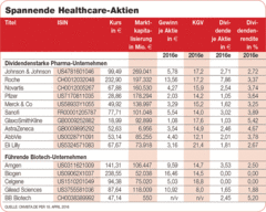 Inzwischen schütten auch einzelne Biotech-Unternehmen wie Amgen oder Gilead Sciences Dividenden aus. Bei den meisten bereits profitablen Biotech-Companies wie Biogen oder Celgene steht die Reinvestition von Gewinnen in die eigene Forschung jedoch nach wie vor im Vordergrund. Aber auch Healthcare-Unternehmen aus den Sparten Medizintechnik oder Dienstleister fallen nicht durch hohe Dividendenrenditen auf.