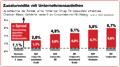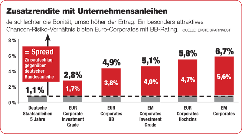 Auf der Suche nach Zusatzrendite wird man auch bei Unternehmensanleihen fündig: Mit fünfjährigen europäischen Corporate Bonds kann man je nach Bonität Zinsaufschläge zwischen 1,7 Prozent für gute Schuldner und 5,6 Prozent für Emerging Markets Corporate Bonds gegenüber deutschen Staatsanleihen lukrieren (siehe Grafik „Zusatzrendite mit Unternehmensanleihen“). Das Emissionsvolumen erreichte im Vorjahr neue Rekorde, nachdem sich die Unternehmen auf dem Kapitalmarkt so billig wie noch nie refinanzieren konnten, um etwa teurere Kredite zurückzuzahlen. Der Vorteil aus Anlegersicht: Damit ist auch das Universum der Emittenten gewachsen. Auf gut Deutsch: „Man kann das Portfolio besser streuen als mit Staatsanleihen“, erklärt Fleischer. Die Risikoaufschläge von Unternehmensanleihen guter Bonität liegen derzeit auf dem niedrigsten Niveau seit der Lehman-Pleite 2008. Das scheint bei hoher Profitabilität durchaus gerechtfertigt. Bei Unternehmensanleihen mit schlechter Bonität, also High Yield Bonds, hält Höllinger die niedrigen Aufschläge dagegen nicht für adäquat. Denn: „Wir rechnen nicht damit, dass die erwarteten Ausfälle damit ausreichend kompensiert werden können“, so die Kathrein-Chefin.