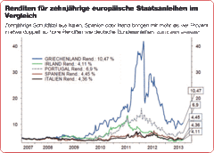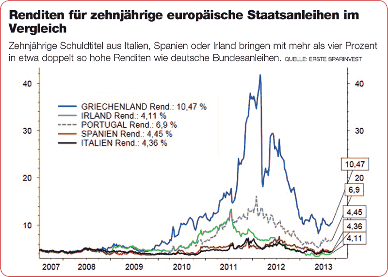 Wer einen höheren Ertrag als die Inflation erwirtschaften will, muss also den Mut haben, höhere Risiken in der Veranlagung einzugehen. Man kann beispielsweise auf die Euro-Peripherie-Staaten, deren Wirtschaften sich langsam wieder erholen, ausweichen: Obwohl die Renditen seit der Finanzkrise inzwischen stark gefallen sind, liefern zehnjährige Schuldtitel aus Italien, Spanien oder Irland mit mehr als vier Prozent in etwa doppelt so hohe Renditen wie deutsche Bundesanleihen (siehe Grafik „Renditen für zehnjährige europäische Staatsanleihen im Vergleich“).